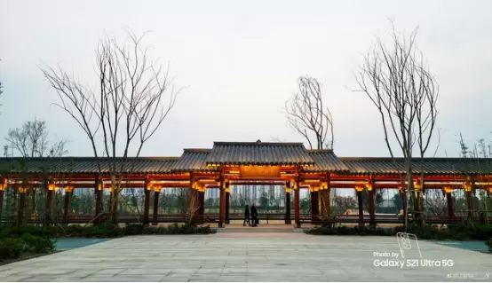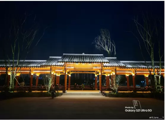 而得益于三星Galaxy S21系列的全新夜间模式,拍摄的样张保持了较高的纯净度,并未出现灯光过曝、暗处模糊不清的情况,甚至远处的树木在灯光照射下还能清晰呈现树杈错落分明的样子,整体观感极佳。