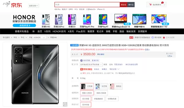 荣耀V40前置搭载1600万像素自拍摄像头,后置搭载5000万像素旗舰级超感光影像系统,由5000万像素超感光主摄、800万超广角摄像头、200万微距摄像头和激光对焦传感器组成。夜景模式下,色彩过渡细腻,准确还原广色温;支持单张长曝光,暗光下色彩还原准确,点点星光自如捕捉。即日起至3月9日京东下单且参与评价的前5000名用户可得1000京豆,购买保值换新版本的用户还享365天全额保值服务。