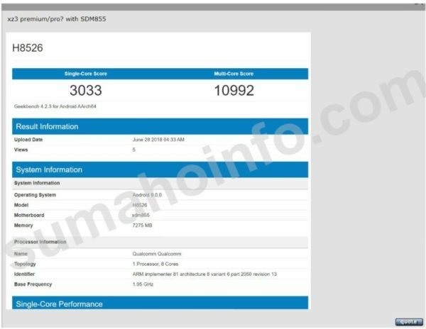 近日,据外媒sumahoinfo报道,一款神秘的索尼新机被GeekBench曝光。该新机型号为H8526,按照索尼的命名习惯,索尼Xperia XZ3很可能是H84XX,所以H85XX很可能是索尼Xperia XZ3的上位机种,比如Pro或者Premium。