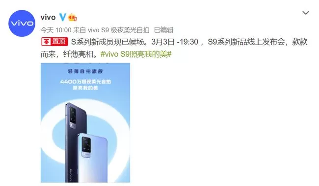 之前vivo官方宣布将于3月3日晚举行新品发布会,正式带来新机vivo S9系列。vivo手机官方微博预热新品S9系列,并发布该机的官方海报