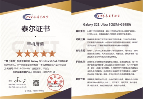 泰尔实验室手机屏幕五星认证 三星Galaxy S21 5G系列屏幕解析
