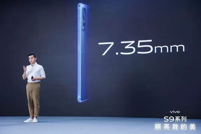 vivo S9机身宽度仅为73.9mm,相比vivo S7缩短0.3mm;机身长度仅为158.39mm,较vivo S7减少0.43mm。子夜蓝颜色vivo S9机身厚度仅为7.35mm,机身重量仅为173g,成为vivo最轻薄的5G手机。