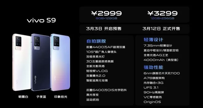售价方面,vivo S9(8+128GB版本)售价2999元,(12+256GB版本)售价3299元;vivo S9e(8+128GB版本)售价2399元,(12+256GB版本)售价2699元,今日开启预售,3月12日正式发售。