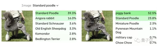 如果我们在贵宾犬的身上加上几串美元符号,那么CLIP就会把它识别为存钱罐。