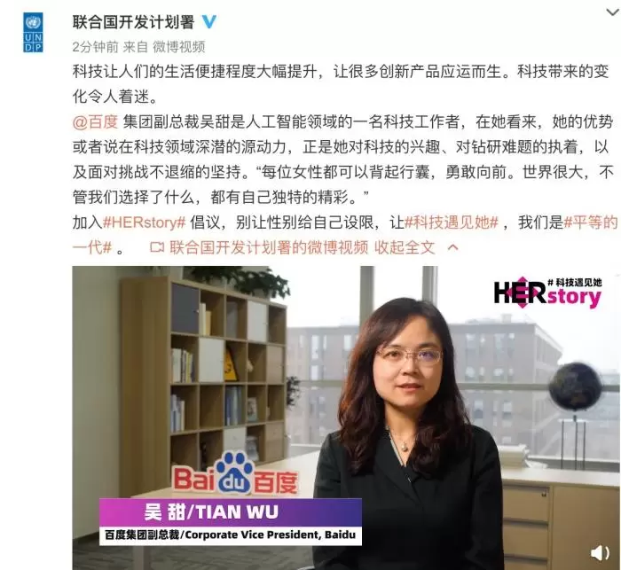 在2021年国际妇女节这天,百度集团副总裁、深度学习技术及应用国家工程实验室副主任吴甜作为人工智能领域女性科技工作者的代表,在参与联合国开发计划署与联合国妇女署共同发起的“HERstory:科技遇见她”倡议活动中寄言:女性在当前职业发展中,并不需要刻意强调与凸显性别带来的优势或劣势,更应把注意力放在扩展自己所关注领域的边界上,专注于攻克难题、承担责任、发挥价值、作出贡献,自然也就是个人最好的成长。