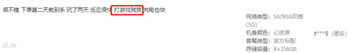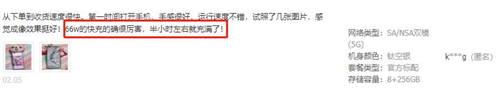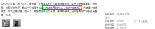 此外,用户对于荣耀V40的游戏体验和快充也是好评不断,譬如“打游戏贼爽”、“玩游戏不热,很流畅”,“充电速度无敌快,35分钟就充满”、“66W快充的确很厉害,半小时左右就充满”等。