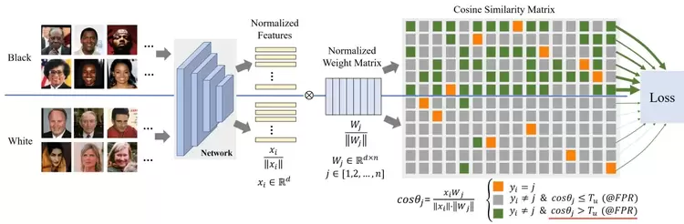 人群偏差是实际人脸识别系统中的重大挑战。现有方法严重依赖准确的人群标签,还不够通用。于是,我们提出了基于误报率惩罚的损失函数,它通过增加实例误报率(FPR)的一致性来减轻人脸识别偏差。具体来说,我们首先将实例FPR定义为高于统一阈值的非目标相似度数量与非目标相似度总数之间的比率。通过给定总FPR,可以估计出统一阈值,然后将实例FPR与总FPR的比例惩罚项引入基于softmax的损失函数分母中。实例FPR越大,惩罚越大。利用这种不平等性的惩罚,使得实例FPR具有一致性。该方法不需要人群标签,并可减轻群体之间因各种属性划分的偏差,而这些属性在训练中无需预先定义,在主流实验基准上的广泛测试结果表明,此方法已达到了SOTA。