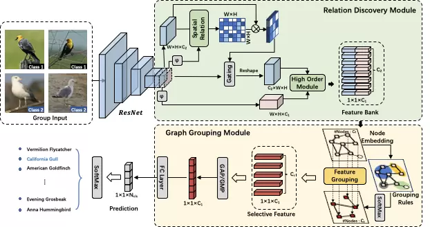 细粒度识别的主要目的是通过学习类别间区分性特征表达来分辨表观高度相似对象,但一般情况下,现有的大多数工作在背景复杂下效果不稳定,且忽略了不同语义特征之间的内在联系。对此,我们提出一种高效的基于图的关系挖掘方法来构建高阶关系间的上下文理解。该方法首先通过特征间语义和位置感知来构建高维特征库(feature bank),同时进行正则化约束。其次本文提出一种基于图的语义分组方法(graph grouping),将高维特征映射到低维空间中,保留其中高区分性特征。在训练过程中,本文还提出一种分组学习策略(group-wise learning),对特征聚类中心进行约束。通过以上三个模块的协作,该方法可学习到细粒度类别间更丰富的区分性信息。实验结果表明,该方法在4个细粒度数据集上均超过SOTA。