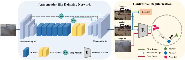 本文提出了一种基于对比学习的新颖对比正则化(CR)技术,以利用模糊图像和清晰图像的信息分别作为负样本和正样本。CR确保在表示空间中将还原后的图像拉到更接近清晰图像,并推到远离朦胧图像的位置。