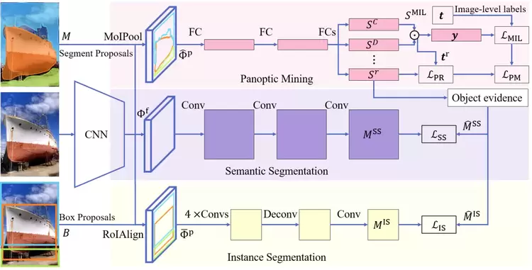 本文为弱监督全景分割提出了一个有效的联合物体与物质挖掘(Jointly Thing-and-Stuff Mining, JTSM)框架,明确地推理了目标前景和物质背景之间的语义和共现关系。为此,算法设计了一种新颖的感兴趣掩模池化(Mask of Interest Pooling, MoIPool),用于提取任意形状分割的固定尺寸的像素精确特征图。MoIPool使全景挖掘分支能够利用多实例学习(Multiple Instance Learning, MIL),并以统一的方式识别物体和物质。算法引入并行实例和语义分割分支,通过自训练进一步修正的分割掩模,其让从全景挖掘中挖掘的掩模和以自底向上的目标线索协作生成伪真实标签,以提高空间一致性和轮廓定位。