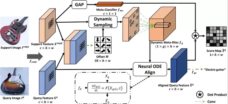 在本文,我们提出了一种动态对齐方式,可根据不同的本地支持信息有效地突出显示查询区域和渠道。具体而言,这是通过首先动态采样以输入的少量镜头为条件的特征位置的邻域来实现的,基于此,我们可以进一步预测依赖于位置和依赖于通道的动态元滤波器用于将查询功能与特定于位置和特定于通道的知识对齐。此外,我们采用神经网络常微分方程(Neural ODE)来实现更精确的对齐控制。通过上述方法,我们的模型能够更好地捕获支持集样本的的细粒度上下文语义。