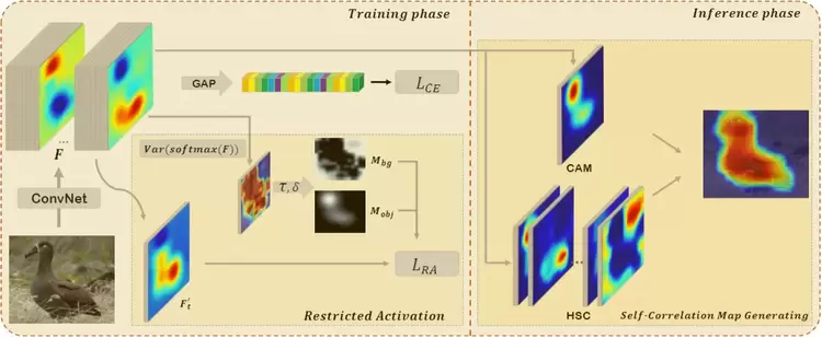 本文提出了一种两阶段的方法,称为结构保持激活(SPA),以充分利用WSOL卷积特征中包含的结构信息。在第一阶段,设计了受限激活模块(RAM)来缓解由分类网络引起的结构缺失问题。该模块基于观察:无约束的分类激活图和全局平均池化层导致网络仅关注目标的局部区域。在第二阶段,提出了一种称为自相关图生成(SCG)模块的后处理方法,基于第一阶段获取的激活图获得结构保持的定位图。具体地,我们利用高阶自相关(HSC)提取保留在模型中的固有结构信息,之后聚合多个位置的HSC得到精确的目标定位结果。在包括CUB-200-2011和ILSVRC在内的两个公开基准上进行的大量实验表明,与基准方法相比,本文提出的SPA方法取得了显著的性能提升。