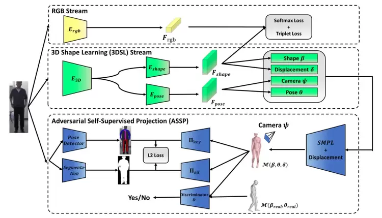 众所周知,行人重识别(Person ReID)高度依赖于服装纹理等视觉信息。但是,实际应用中存在多种纹理混淆的情况,这超出了大多数现有ReID方法的能力范围。因此,我们提出利用人的三维形状和身材信息来提高ReID对纹理混淆的鲁棒性,而不仅依赖于图像纹理信息。现有的person ReID使用的形状学习模型要么忽略了人的真实三维信息,要么需要额外的物理设备来采集三维源数据。在本文中,我们提出了一种新颖的学习框架,即结合三维形状学习(3DSL)模型: 加入三维人体重建作为正则化,直接从二维图像中提取纹理不敏感的3D模型编码信息。基于正则化的三维重建迫使ReID模型将三维形状信息从视觉纹理中解耦,获得具有判别性的三维形状ReID特征。为了解决缺乏三维ground truth的问题,我们提出了一种对抗式自我监督投影(ASSP)方法以拟合不需要ground truth监督训练的三维重建模块。在通用ReID数据集和纹理混淆数据集上的大量实验验证了我们模型的有效性。