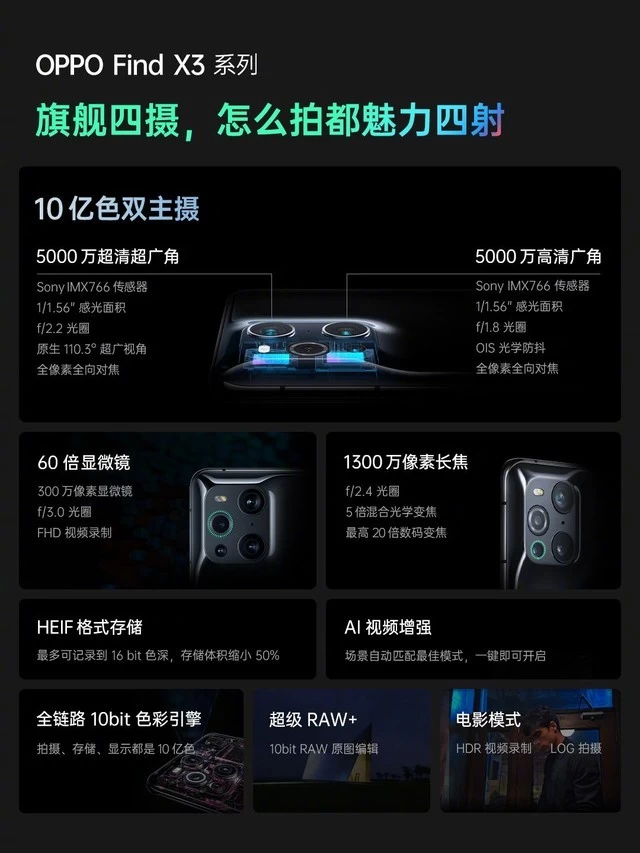 OPPO Find X3系列使用 5000 万像素 1/1.56 寸 双主摄,搭配两个索尼联合开发传感器 IMX766,60 倍显微镜,1300 万长焦镜头,捕捉前所未有的影像细节。全链路 10 bit 色彩引擎,拍摄、存储、显示都是10亿色。