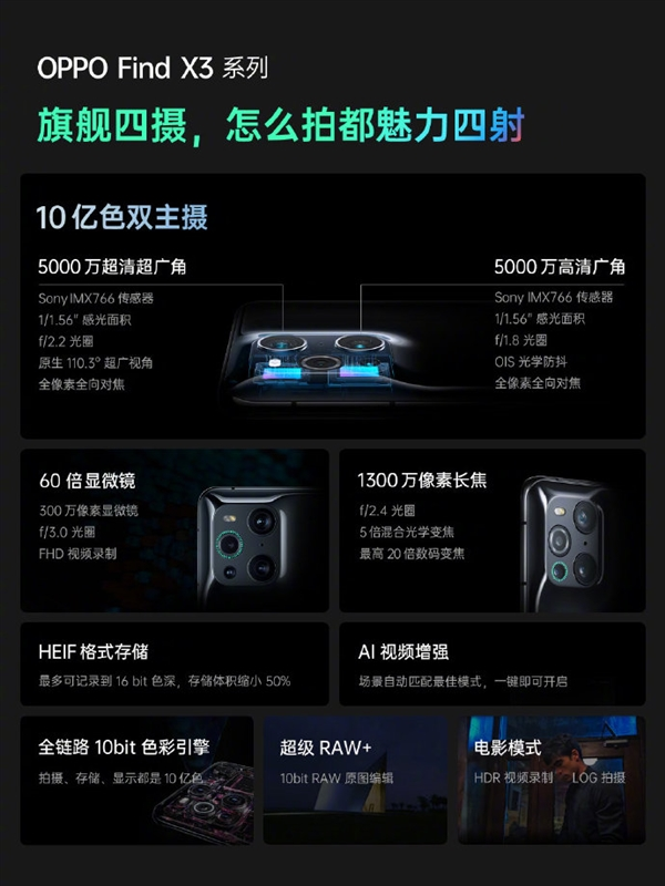 Find X3系列拍照:10亿色双主摄、全链路10bit色彩