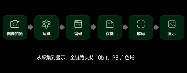 所谓全链路10bit色彩引擎即从拍摄、编码、存储、解码、显示整条图像处理过程全链路均由10bit色彩加持,各环节均具备处理10bit数据能力(敲重点敲重点)。这样做的好处是能够解决底层系统对于10bit图像信息不兼容问题。用图片表示即如下图所示: