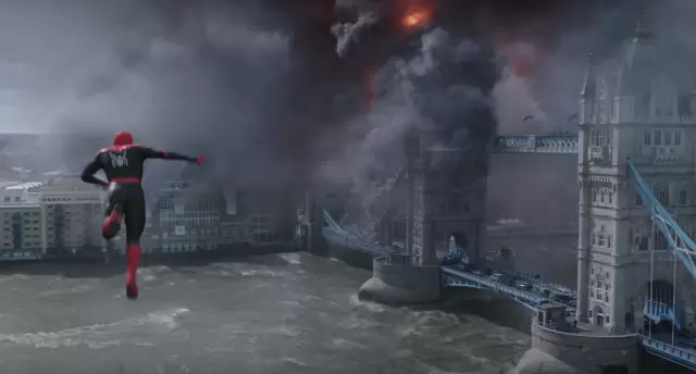 而在《蜘蛛侠·英雄远征》中,最核心的技术秀无疑也是全息投影。片中的反派神秘客将全息投影搭载在无人机上,利用无人机的机动性,快速地改变摄像头的角度,实现多场景、多视角的变幻效果。蜘蛛侠就在这全息幻境中与神秘客贝克展开对决,光怪陆离,魔幻而奇异,算是影片的一大亮点。
