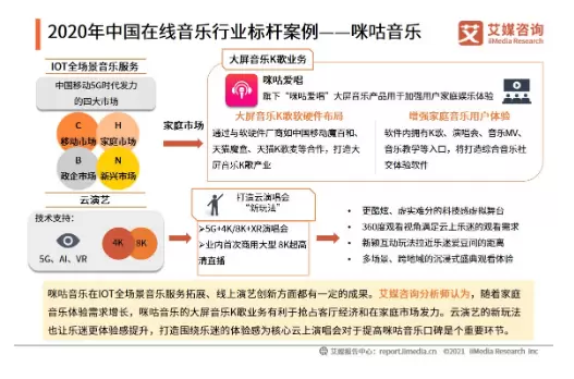 自5G技术出现以来,咪咕音乐凭借自身优势不断探索“5G+应用”,通过加速推动应用场景沉浸以及举办演艺活动获得广大网友的关注,咪咕音乐全年350+场音乐演出,其中“云上Liveshow”累计观看次数达1.8亿,推出5G+4K+VR直播的日常音乐演出MELIVE SPECIAL等。举行国内首次5G+4K/8K+XR超高清演艺直播——“2020神武4·动感地带第十四届音乐盛典咪咕汇”。
