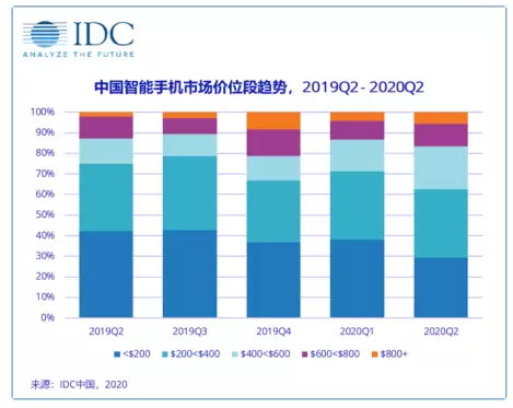 手机始终处于中低端向中高端发展的路径上,IDC报告显示,2018年,中端智能手机市场首次超越低端手机市场。智能手机市场的“消费升级”悄然展开。如今,高端手机的市场趋势更加明显,2019年四季度后,600-800+美元的产品占比持续稳定在15%以上。此前的低端机纷纷提升价位,高端市场正在变成大众市场,手机市场“4000+”时代正在到来。