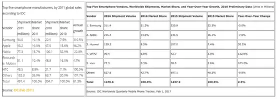 下图是2011年全球智能手机市场出货量报告。喧嚣的手机市场,如同楚河汉界,旧秩序瓦解,新王当立,此时纵然已有“中华酷联”、小米魅族,前五名还没有一家大陆手机品牌。
