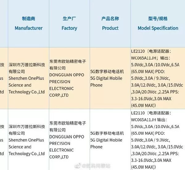 据透露,一加9系列的两款机型已获国家3C认证。根据认证信息,一加9全系标配了65W快充和4500mAh双电芯方案,续航能力进一步加强。此外,该博主还表示,一加9 Pro确定支持无线充电功能,但标准版暂时还不太清楚。