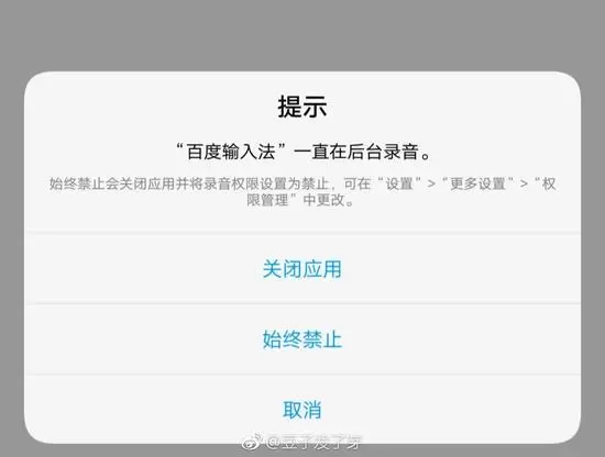 在该系统升级后,有用户使用百度输入法时,发现在通知栏弹出“百度输入法一直在后台录音”的提醒,并告知用户可以在设置中,进行权限管理更改。