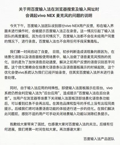在QQ浏览器偷偷调用摄像头事件后,vivo NEX官方进行了系统升级,加入了对第三方应用调用摄像头、麦克风的提醒功能。之后有网友发现并爆料称,百度输入法在未唤醒语音输入时,存在偷偷录音的现象。百度对此回应显示输入法做了语音麦克风预热的优化,但目的是为了加快语音启动速度,解决用户反馈的语音识别丢字问题,并未进行录音处理。
