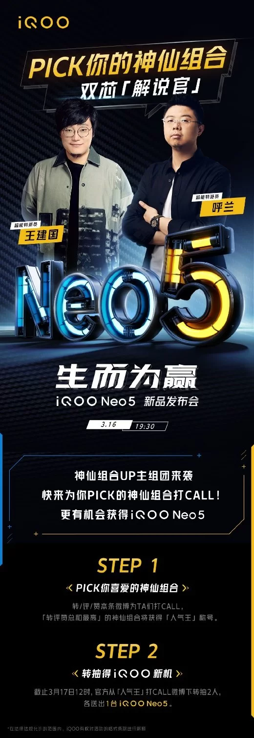 2021年3月15日,“双芯旗舰”iQOONeo5将于3月16日19:30正式发布,新品秉持“生而为赢”的态度,拥有高通骁龙870领衔的“性能超体”,以及独立显示芯片、66W闪充和超感游戏体验等卖点,受到用户广泛关注。本次发布会上,呼兰和王建国更是亲自担任“超能特派员”,组成“建兰春”合体亮相iQOO Neo5发布会,“双星合璧”给你唠唠双芯旗舰的强悍,还有建国呼兰更多爆笑游戏趣事!