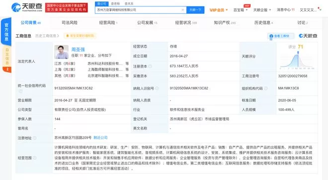 天眼查App显示,涉事公司苏州万店掌网络科技有限公司成立于2016年4月,法定代表人及最大股东为周圣强,持股比例约53.5%。该公司注册资本约673万人民币。