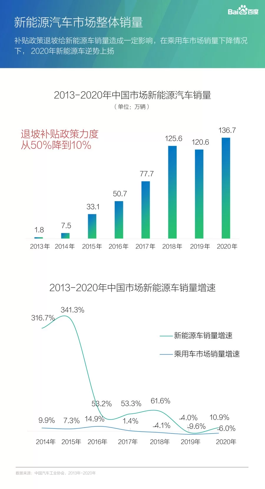 近日,百度营销依据用户的搜索习惯,通过搜索大数据分析,发布了《百度营销新能源汽车行业洞察报告》,对新能源汽车的关注点趋势和特征分布进行详细解读。报告指出,虽然补贴政策退坡给新能源车销量造成一定影响,但新能源汽车正迎来产业发展“暖春期”,在乘用车市场销量下降情况下,仍然实现了10.9%的增长。
