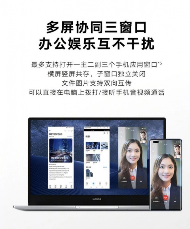 以荣耀全场景打造的多屏协同为例,荣耀MagicBook与手机之间的多屏协同,不仅支持二者文件互传,更利用MagicBook的运算能力和专业系统能力,将MagicBook和手机进行融合,从系统底层打通Windows和安卓的藩篱,实现无缝协同。MagicBook的键盘、鼠标成为手机的外设,同时也利用MagicBook更专业的应用生态,进行跨系统、跨平台的高效操作。带来前所未有的创新办公体验。