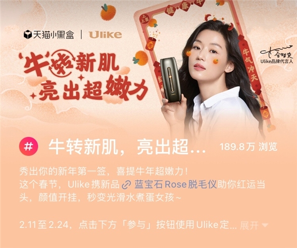 打造#牛转新肌,亮出超嫩力#话题则结合Ulike“嫩肤”的产品亮点,通过上百位美图达人带话题创作助力,掀起了一场全民狂欢热潮,活动话题浏览量超185万,UGC内容超2900条,全面提升了营销的广度和深度。