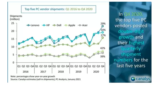 近一年以来,沉寂许久的PC市场开始爆发。根据Canalys的一份新报告,2020年全年,PC出货量增长11%,达到2.97亿台,这是自2010年以来最高的全年增长,也是2014年以来最高的出货量。