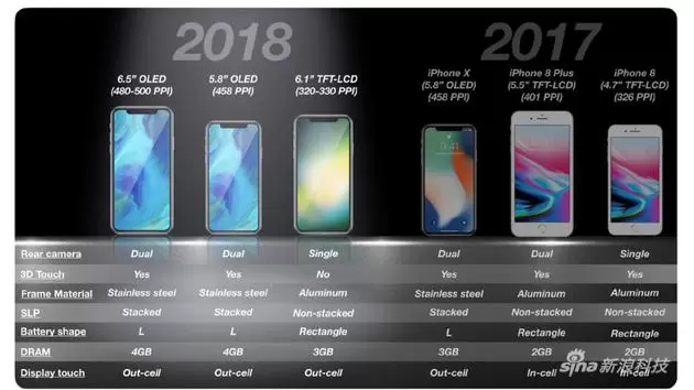今年三款齐放消息早已为人们所熟悉:5.8英寸OLED屏幕版本;6.1英寸屏幕版,采用LCD屏幕,分辨率比较低,但价格也比较实惠;另外还有个6.5英寸,采用OLED屏幕,定位旗舰。