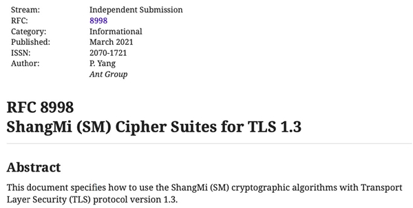 本次发布的RFC 8998标准中定义了两个TLS 1.3中的国密加密套件,⼀个SM2椭圆曲线ID,以及⼀个SM2-SM3的签名⽅法。本标准由蚂蚁集团牵头起草,标准推进讨论中,也得到了阿里云、北京大学、360、天威诚信、江南天安、云钥网络、上海CA等机构的认可和支持。该标准的发布有效解决了国密算法在TLS 1.3协议中应用的互联互通问题,将大力促进国密算法的应用。