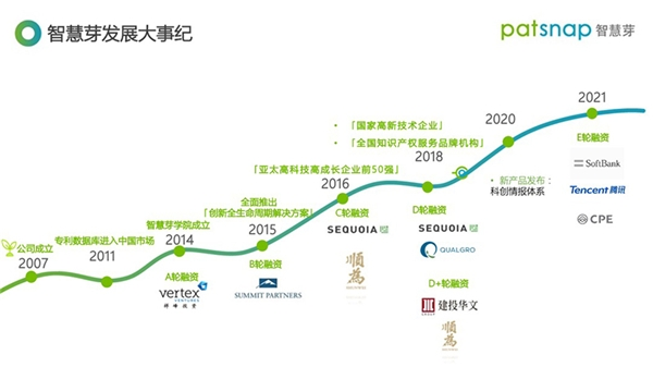 2021年3月17日,智慧芽(PatSnap)宣布完成3亿美元的E轮融资,本轮融资由腾讯和软银愿景基金二期领投,CPE跟投,红杉中国、顺为资本和祥峰投资等老股东继续加持。指数资本担任独家财务顾问。