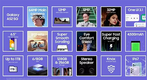 “三星电子始终致力于推出满足消费者需求的产品。我们希望将三星的创新成果惠及大众,为实现这一愿景,Samsung Galaxy A系列应运而生。”三星电子移动通信部门总裁卢泰文表示,“三星Galaxy A52 5G集尖端科技、服务、功能于一身,既彰显Samsung Galaxy品牌理念,又实现了亲民价格。”