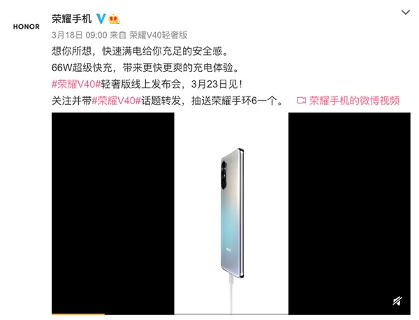 3月18日,荣耀手机在微博宣布,荣耀V40轻奢版将于3月23日正式发布。目前,荣耀V40轻奢版已在京东同步开启预约,参与预约还有机会赢取好礼。