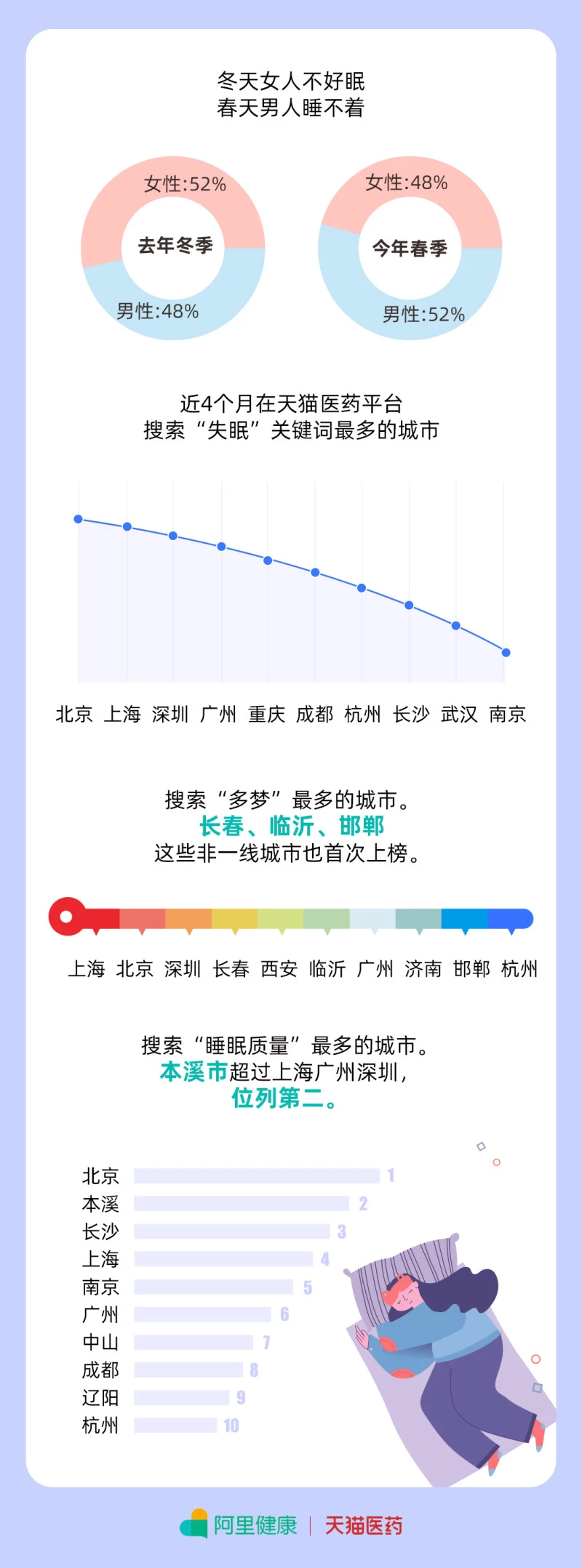 除“失眠”之外,在天猫医药平台搜索“多梦”、“睡眠质量”等关键词的消费者中,一些非一线城市,如长春、临沂、邯郸、本溪,都排在前列。看来中小城市的人们在睡眠问题上更关注睡眠质量。