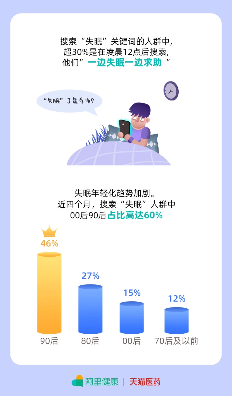 3月20日,世界睡眠日前夕,阿里健康基于天猫医药平台相关数据发布《睡不着报告》,图鉴显示,失眠年轻化加剧,6成以上为90后00后,更有3成失眠者是放下手机才能睡的“假性失眠”人群。
