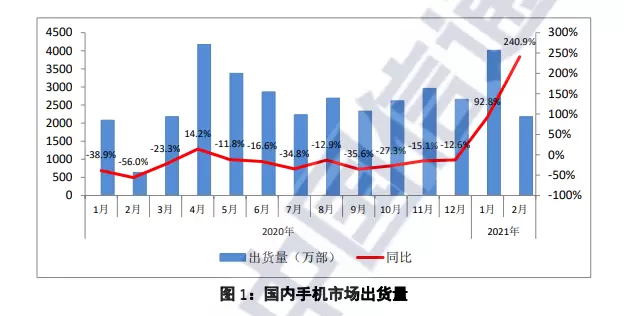 中国信息通信研究院近日发布的2月国内手机市场运行分析报告显示,2月国内手机市场总体出货量达2175.9万部,同比增长240.9%;1-2月期间,国内手机市场总体出货量累计达6187.9万部,同比增长127.5%。