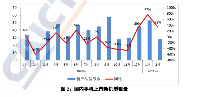 而从国内外品牌构成来看,2月国产品牌手机出货量达1956.6万部,同比增长234.0%,占同期手机出货量的89.9%;上市新机型28款,同比增长47.4%,占同期手机上市新机型数量的100%。1-2月,国产品牌手机出货量累计达5329.3万部,同比增长120.4%,占同期手机出货量的86.1%;上市新机型累计77款,同比增长75.0%,占同期手机上市新机型数量的95.1%。