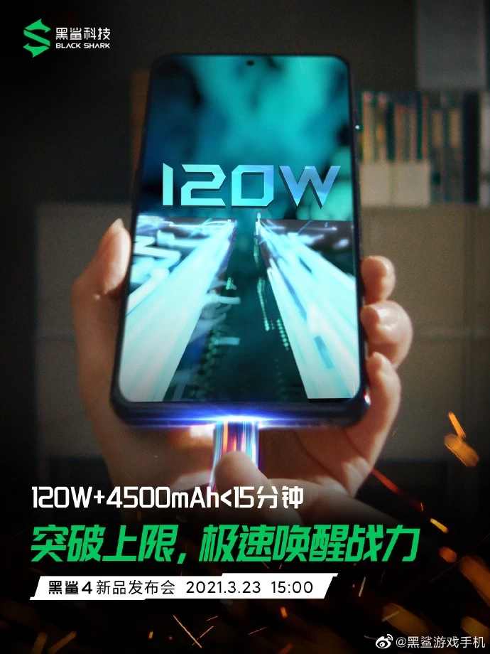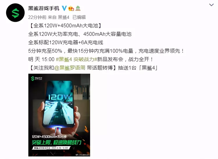 今天上午,黑鲨官微再曝该系列手机重要配置信息——“120W+4500mAh超大功率极速闪充”;早在今年1月,黑鲨CEO罗语周就曾公布了“120W”的预热海报,这次相当于官方实锤了之前的预热消息,证实了120W极速闪充技术将应用在黑鲨4系列上。
