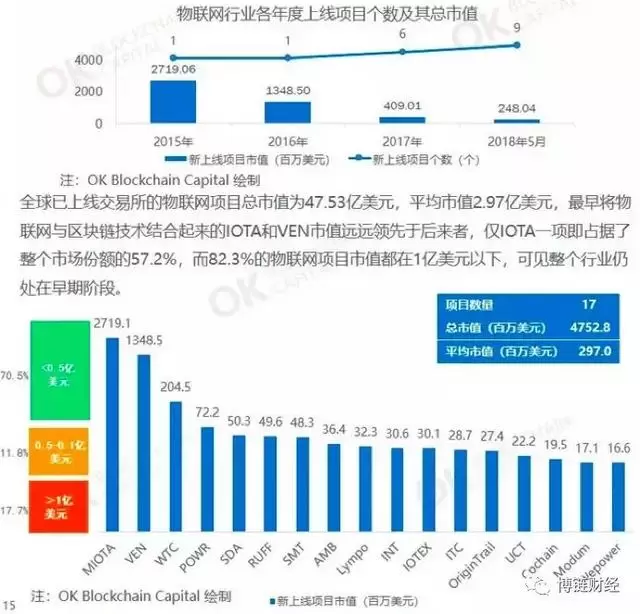 据不完全统计,2015年发展至今,全球区块链物联网项目已有数十个。其中,已上线交易所的项目有17个,总市值达47.53亿元。