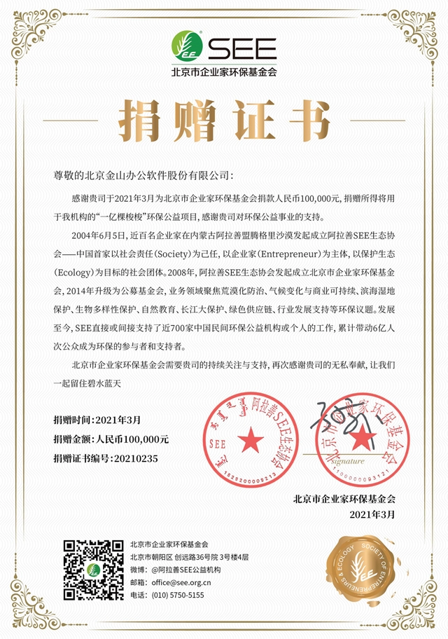 近日,金山办公向SEE基金会(北京市企业家环保公益基金会)进行捐赠,支持该机构“一亿棵梭梭”项目在内蒙古阿拉善盟种下1万棵梭梭。