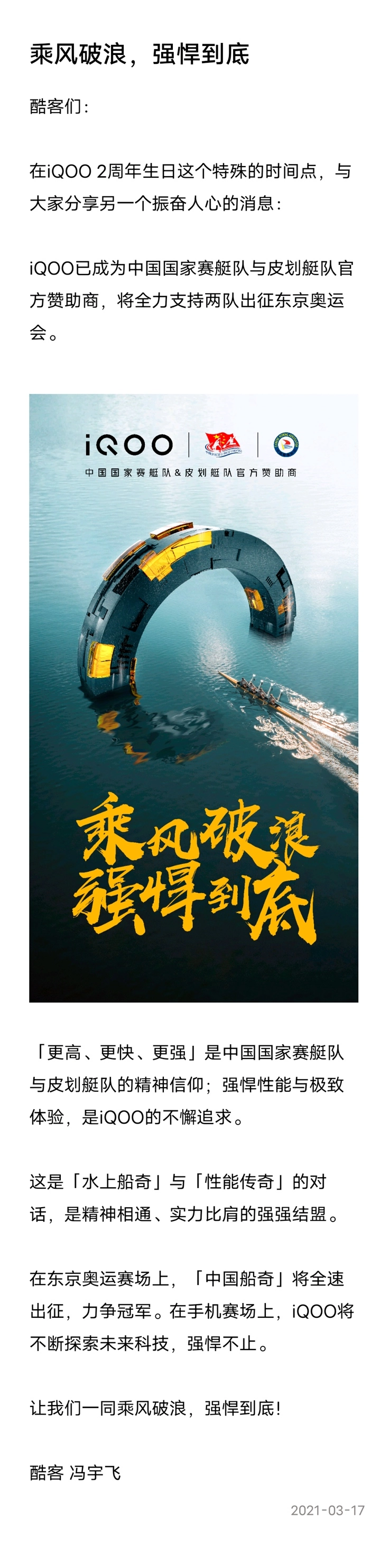对于此次赞助iQOO中国市场总裁冯宇飞表示,“中国船奇”以不服输的拼搏精神不断超越,飞速迎头赶上才拥有了比肩世界强队的夺金实力。而在手机领域,面对众多强大的全球同行,年轻的iQOO不但毫不畏惧,反而爆发出强大的能量成为未来电竞旗舰,这是“水上船奇”与“性能传奇”的对话,是精神相通、实力比肩的强强结盟。因此,在东京奥运的赛场上,“中国船奇”将全速出征,力争冠军;在电子竞技的赛场上,iQOO也将不断探索未来科技,强悍不止。