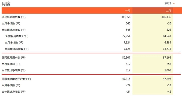 3月23日消息,中国联通公布其2021年2月份运营数据,当月中国联通净减移动出账用户2万户,累计达3.06336亿户。其中,5G用户当月净增658.9万户,累计达8454.3亿户。