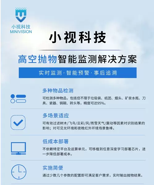 2021年3月5日,小视科技发布高空抛物智能监测解决方案,该解决方案基于端到端的深度学习方法,实时检测跟踪视频中所有的移动物品,通过轨迹过滤规则,可有效进行高空抛物的智能监测。