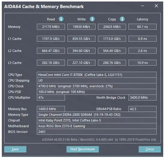 此时AIDA 64下内存的读取速度为21170MB/s,写入速度19838MB/s,复制内存20425MB/S, 分别提升至9.7%、7.5%、10.4%,内存延迟60.1ns,而时序依旧保持C19-19-19-43不变。
