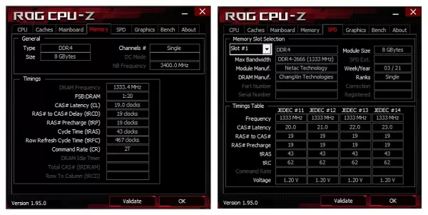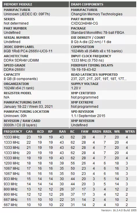 CPU-Z的SPD选项页,同样识别出为长鑫颗粒,频率2666MHz,电压是1.2V。